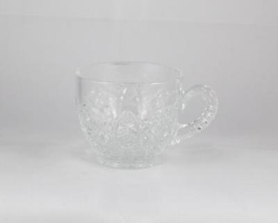 Clear glass punch cups with a geometric and floral pattern. The cups have pressed glass mold marks.